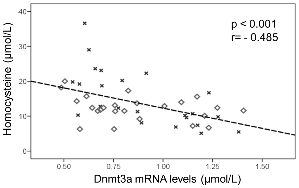 Finally, It has been previously suggested that liver DNA methylation capacity could be decreased when Aldo-homocysteine intracellular concentration is increased, since this metabolite is associated with plasma hyperhomocysteinemia [12,45]. In this sense, the results of Dnmt3a mRNA levels and plasma homocysteine values showed a noteworthy inverse correlation in both sexes (Figure 6) (r value = −0.485; p < 0.001), reinforcing the association hypothesis between DNA methylation and homocysteine metabolism. Contrariwise, hepatic Dnmt3b mRNA levels were not correlated with plasma homocysteine concentrations, which could be due to the different specific roles of both enzymes. Furthermore, the Dnmt3b statistical p value (marginally significant) and fold changes make it necessary to be cautious with the interpretation of these data.