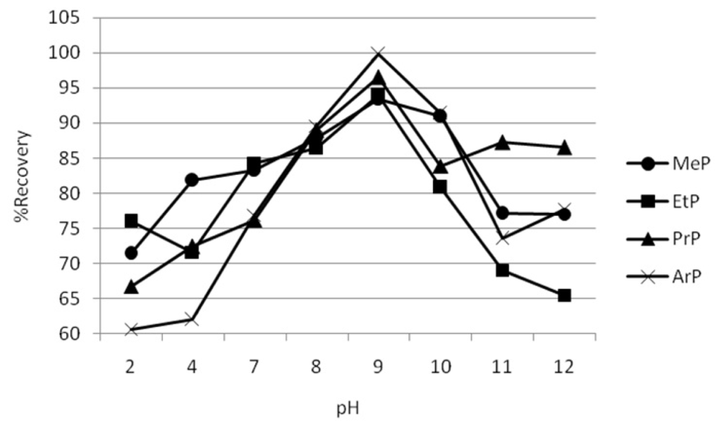 2.1. Effect of pH on Extraction Recoveries of Parabens Extraction