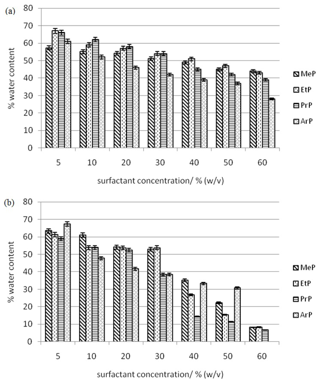 Based on Figure 2, ArP in the CPE-DC193C-βCD-IL method contains the highest amount of water at the beginning of experiments with almost 68% (w/v) of water content in the surfactant-rich phase at 5% (w/v) of surfactant concentration. This percentage was rapidly reduced to 0% (w/v) of water content at 60% (w/v) of surfactant concentration. A total loss of 68% was measured when the surfactant concentration was increased from 5% (w/v) to 60% (w/v) using the CPE-DC193C-βCD-IL method. This is considered the highest loss of water content when compared with the CPE-DC193C method. The overall loss of water content in the CPE-DC193C-βCD-IL method for methyl paraben (MeP) is 55%, followed by the ethyl paraben (EtP) and propyl paraben (PrP) with 52% respectively. This result clearly shows that the CPE-DC193C-βCD-IL method had produced the highest loss of water in the surfactant-rich phase.