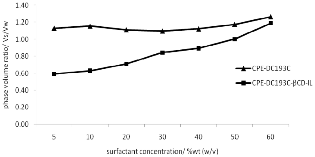 This study was conducted to investigate the effect of the phase volume ratio on the preconcentration factor. Figure 3 shows the phase volume ratio for CPE-DC193C-βCD-IL method and CPE-DC193C method corresponding to the surfactant concentrations. The lower phase volume ratio will produce a good result because it will reduce the final surfactant-rich phase, resulting in a higher preconcentration factor. Concomitantly, the higher recoveries of paraben extraction will be produced. The CPE-DC193C-βCD-IL method offers an obviously low phase volume ratio compared with the CPE-DC193C method, with the value of phase volume ratio 0.84 at 30% (w/v) surfactant concentration. The CPE-DC193C-βCD-IL method shows a marked increase on the phase volume ratio when the surfactant concentration is increased, at the same time proposing that the phase volume ratio of CPE-DC193C-βCD-IL is influenced by the surfactant concentration. Meanwhile, the CPE-DC193C method shows a constant value of the phase volume ratio when the surfactant concentration is increased. These results show that βCD-IL makes clear the phase separation and the surfactant-rich phase and aqueous phase form easily, thereby giving the concentration of the surfactant significant influence over the phase volume ratio of the CPE-DC193C-βCD-IL method.