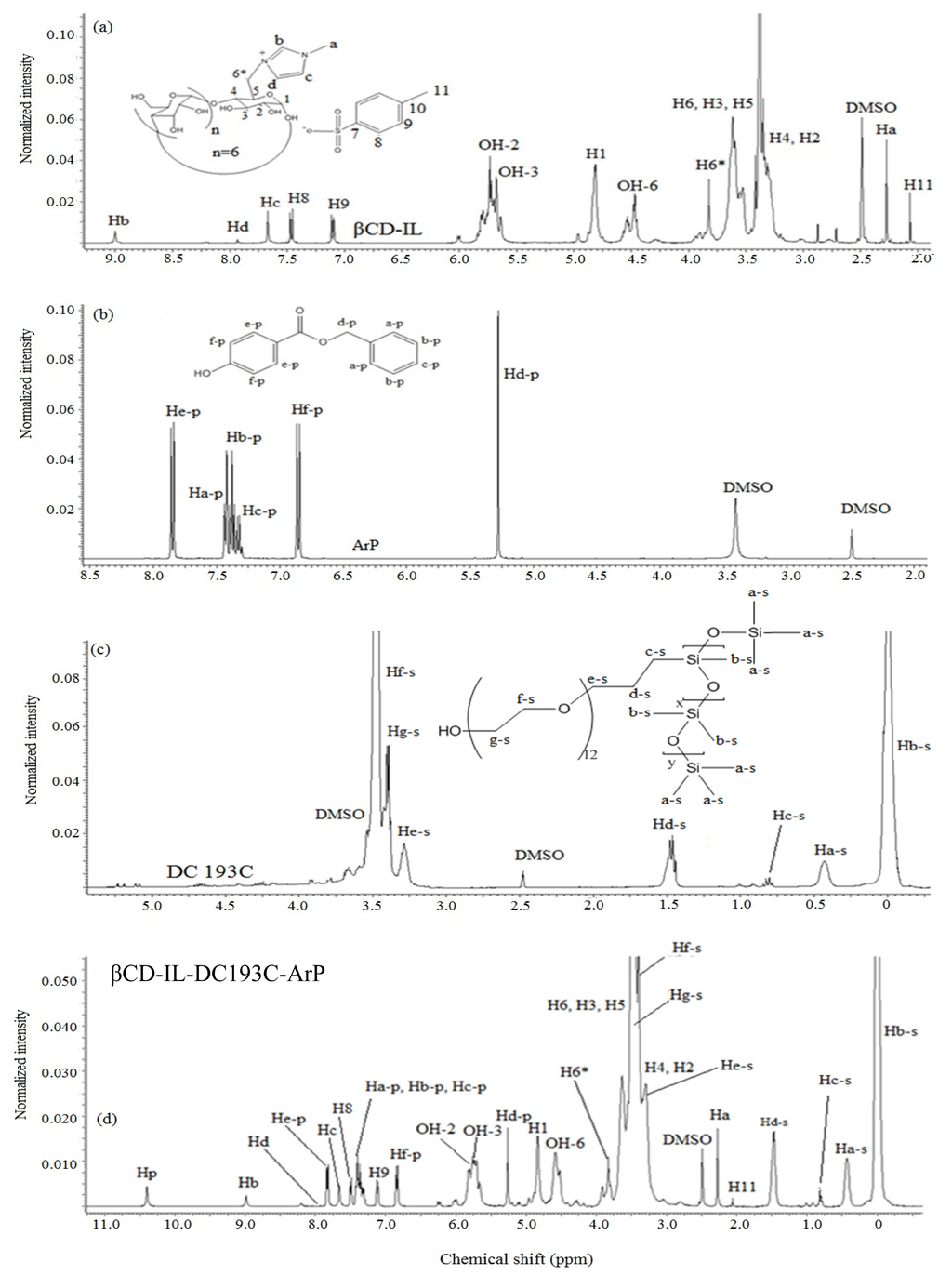 1H NMR spectrum of (a) βCD-IL; (b) ArP; (c) DC193C; and (d) βCD-IL-DC193C-ArP.