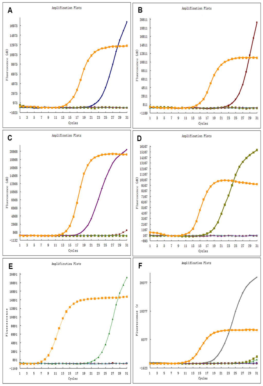Representative results for ADx-ARMS of EGFR mutation testing. (A–F) demonstrate the typical results of exon 19 deletion mutation, exon 21 L858R point mutation, exon 21 L861R point mutation, exon 18 G719X point mutation, exon 20 T790M point mutation, exon 20 insertion mutation, respectively. The orange lines are the internal control signal (HEX), the blue lines, red lines, purple lines, dark green lines, light green lines and the gray lines are mutant signal (FAM), representing 19-del, L858R, G719X, T790M and 20-ins, respectively.