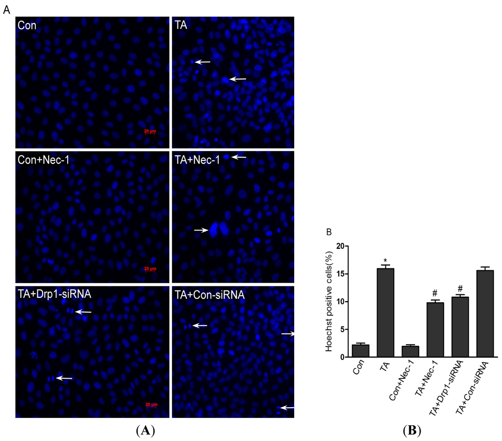 Nec-1 protected against simulated ischemia-induced cell death measured by Hoechst 33258 staining. (A) NRK-52E cells were exposed to simulated ischemia injury of NRK-52E cells with TNF-α stimulation and ATP depletion. After that, NRK-52E cells were incubated with Nec-1 (20 μM) or Drp1-siRNA (50 nM). Then, cells were stained with Hoechst 33258 (blue) Images were obtained with a fluorescent microscope. All the nuclei are uniformly weak-stained in the control group. White arrows indicate the nuclei of cell deaths (bright blue). Original magnification: ×200; (B) Quantification of Hoechst positive cells (%) in NRK-52e cells treated with different treatments. Data were counted from 200 cells per field and twenty fields were analyzed in each group. Note: *p < 0.01, vs. Con group; # p < 0.01, vs. TA group.