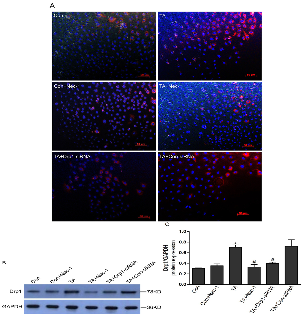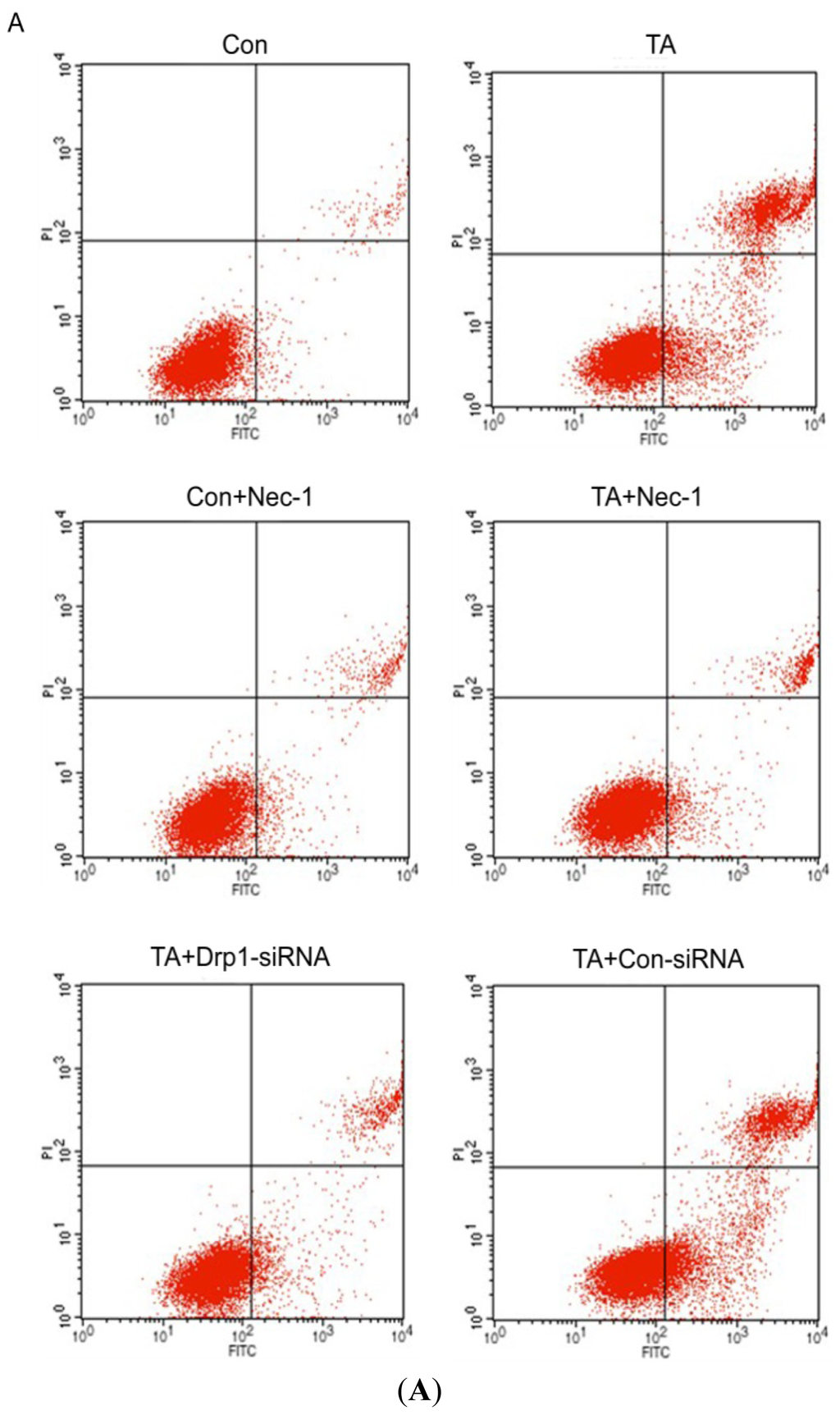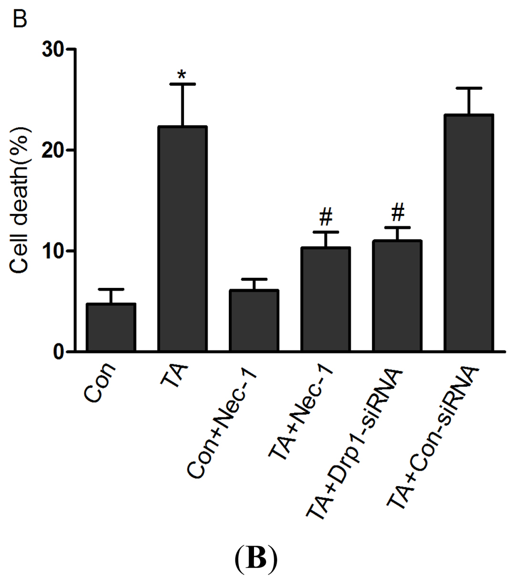 Cells were divided into six groups as follows: (1) Control group: cells were maintained in RPMI-1640 medium supplemented with 10% FBS for 24 h; (2) TA group: cells were treated with 10 ng/mL of TNF-α and 10 μM antimycin A for 24 h; (3) Nec-1 + control group: cells were pretreated with 20 μM of Nec-1 for 24 h; (4) Nec-1 + TA group: cells were pretreated with 20 μM of Nec-1, 10 ng/mL of TNF-α and 10 μM antimycin A for 24 h; (5) TA + Drp1-siRNA group: cells were pretreated with 50 nM of Drp1-siRNA for 24 h, and then continuously treated with 10 ng/mL of TNF-α and 10 μM antimycin A for 24 h; and (6) TA + Con-siRNA group: cells were pretreated with 50 nM of scrambled siRNA for 24 h, and then continuously treated with 10 ng/mL of TNF-α and 10 μM antimycin A for 24 h. siRNA knock down was performed according to the manufacturer’s instructions.