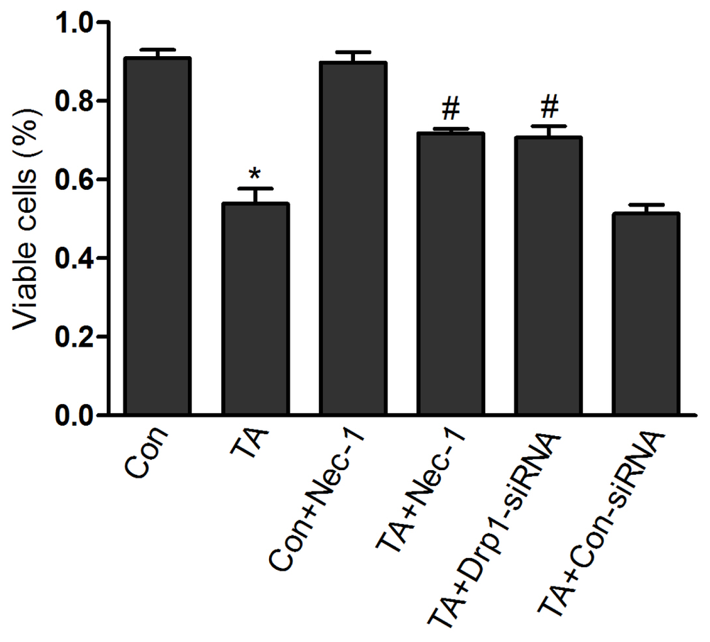 As shown in Figure 3, cell viability was significantly decreased in the TA group (53.88% ± 3.82%), compared to control group (90.87% ± 2.20%) (p < 0.01). After treatment with Nec-1 (20 μM) for 24 h, we observed that Nec-1 pretreatment markedly increased cell viability from 53.88% ± 3.82% (TA group) to 71.75% ± 1.21% (Nec-1 + TA group) (p < 0.01). The pretreatment with Nec-1 (20 μM) had no effect on cell viability in the control group. We can see this by comparing the Nec-1 + control group (89.78% ± 2.64%) with the control group (90.87% ± 2.20%) (p > 0.05).