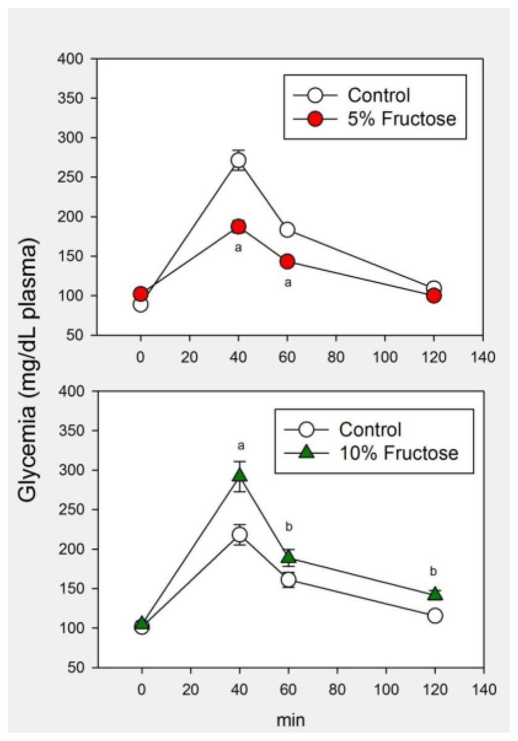 We took advantage of this approach to define two stages of the metabolic syndrome caused by fructose, by giving for 8 weeks either a 5% or a 10% fructose solution (in which fructose accounted for 21%–27% and 48%–57% of total caloric intake, respectively [13]). Rats receiving 5% fructose exhibited a greater tolerance to glucose, as demonstrated by the lower glycemia values achieved after i.p. glucose administration as compared to controls. In contrast, rats having access to a 10% fructose drinking solution showed an impaired glucose tolerance compatible with insulin resistance.