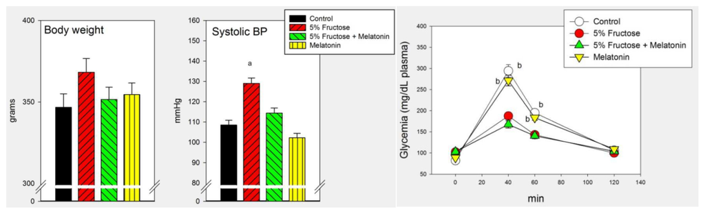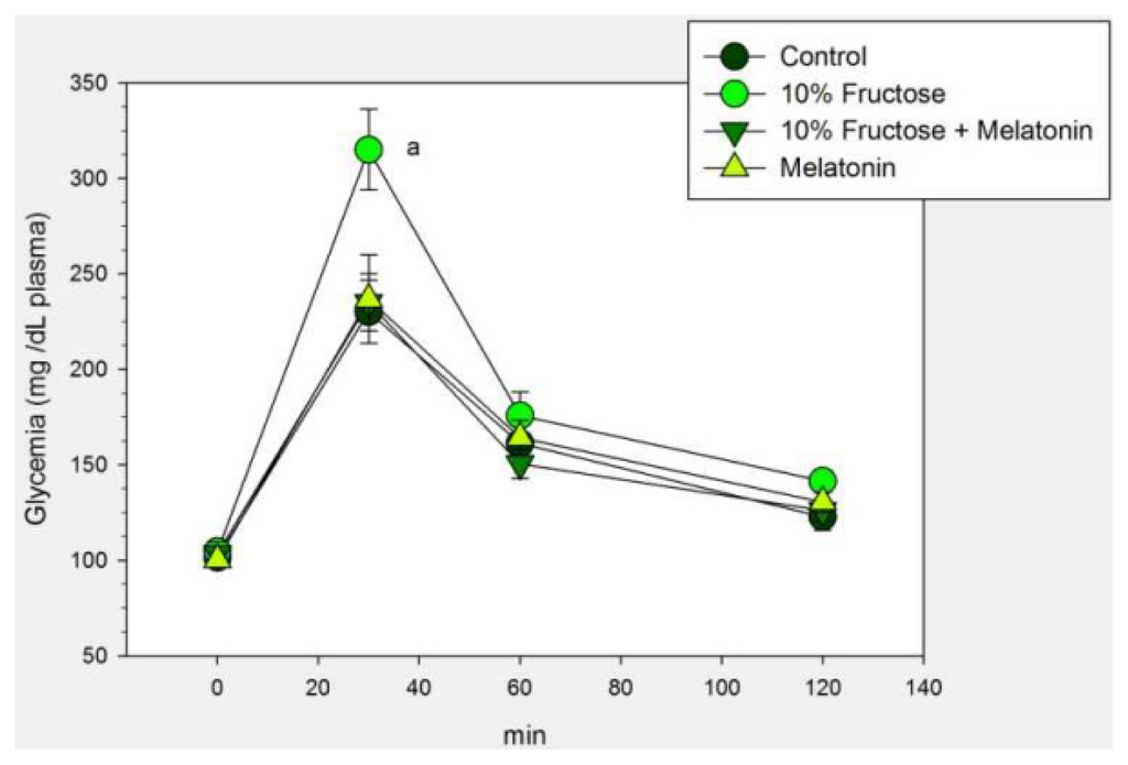 Among several substances with the capacity to curtail fructose-induced metabolic syndrome, melatonin has received attention because of its very low or absent toxicity that turns it potentially appropriate for human use. In high-fat/high sucrose-fed rats giving an intraperitoneal (i.p.) injection of 4 mg/kg body weight melatonin every morning for 8 weeks, starting after 20 weeks of feeding, weight gain inhibition occurred together with improved insulin sensitivity [8]. Rats fed a diet containing 60% fructose exhibited an inhibition of melatonin secretion and turned hypertensive unless a daily supplementation of melatonin (30 mg/kg in drinking water) was given [9].