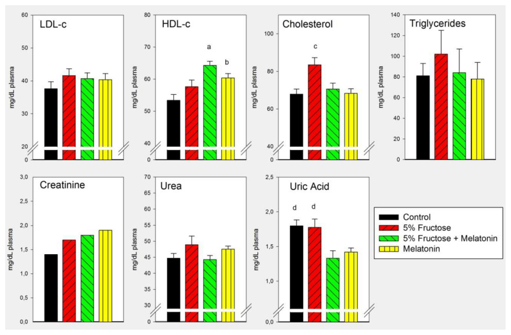 Plasma levels of LDL-c, HDL-c, cholesterol, triglycerides, creatinine, urea and uric acid in rats that had free access to chow and drinking solutions containing 0.015% ethanol (control), 0.015% ethanol plus 5% fructose, 5% fructose plus 25 μg/mL of melatonin or 25 μg/mL of melatonin for 8 weeks. Controls received tap water. Shown are the means ± SEM (n = 8 per group). Letters indicate the existence of significant differences between the experimental groups after a one-way ANOVA followed by a post-hoc Bonferroni’s test, ap < 0.01 vs. control; bp < 0.05 vs. control; cp < 0.02 vs. the remaining groups; dp < 0.04 vs. melatonin-treated rats. For further statistical analysis, see text.