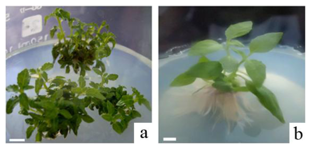 After 1 to 2 months, the root formation was lignified, and the well-developed plantlets were removed from the media. The plantlets were gently washed under running tap water to remove the adhering media. For the hardening process, the plantlets were transferred into plastic cups containing a mixture of sterile compost. The regeneration experiments were designed with 10 Petri dishes for shoot regeneration and 10 triangular flasks for rooting per treatment, and each dish contained at least six leaf explants per treatment for shoot regeneration analysis, and each flask contained three shoots per treatment for rooting frequency analysis. Experiments were done in triplicate. The cultures were incubated at 25 °C ± 2 °C under a 16 h photoperiod (45 μmol m−2 s−1).