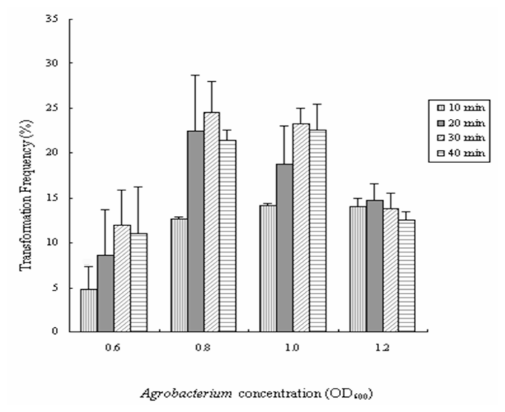 Frequency of transformation of Populus davidiana Dode × Populus bollena Lauche with different Agrobacterium concentrations and infection times.