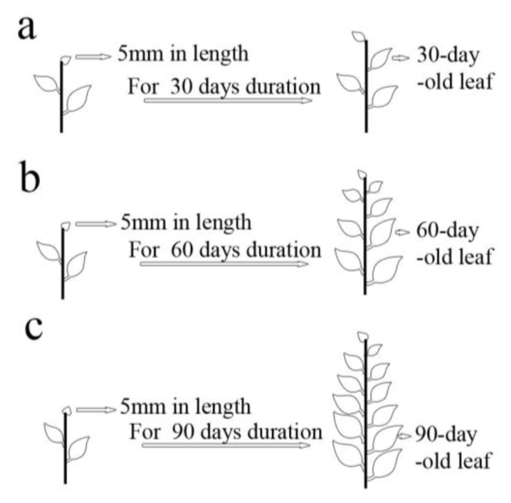 Leaf age definition diagram. Leaf age was defined as 30-, 60-, and 90-day-old growth from a 5 mm leaf in length.