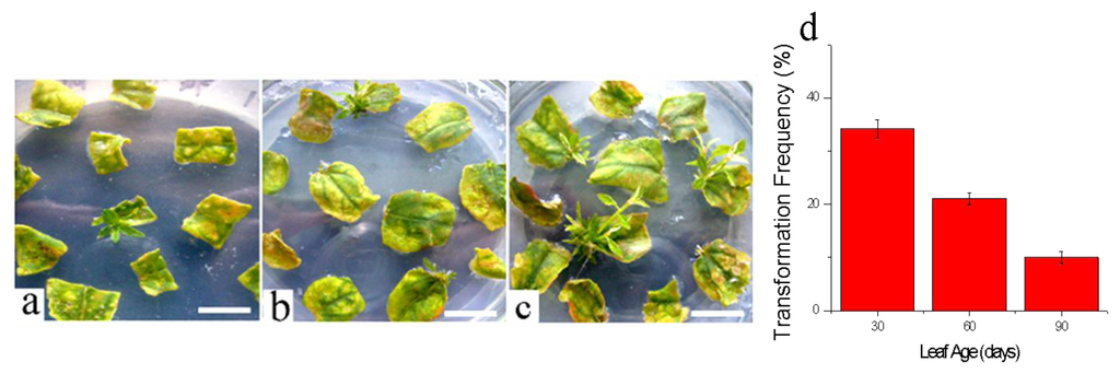 Transgenic shoot on regeneration-selection medium containing 50 mg/L Kan and 200 mg/L Cef. (a) 90-day-old leaf; (b) 60-day-old leaf; (c) 30-day-old leaf. Scale bar 1 cm. (d) Transformation percentage per leaf age from more than 100 samples.