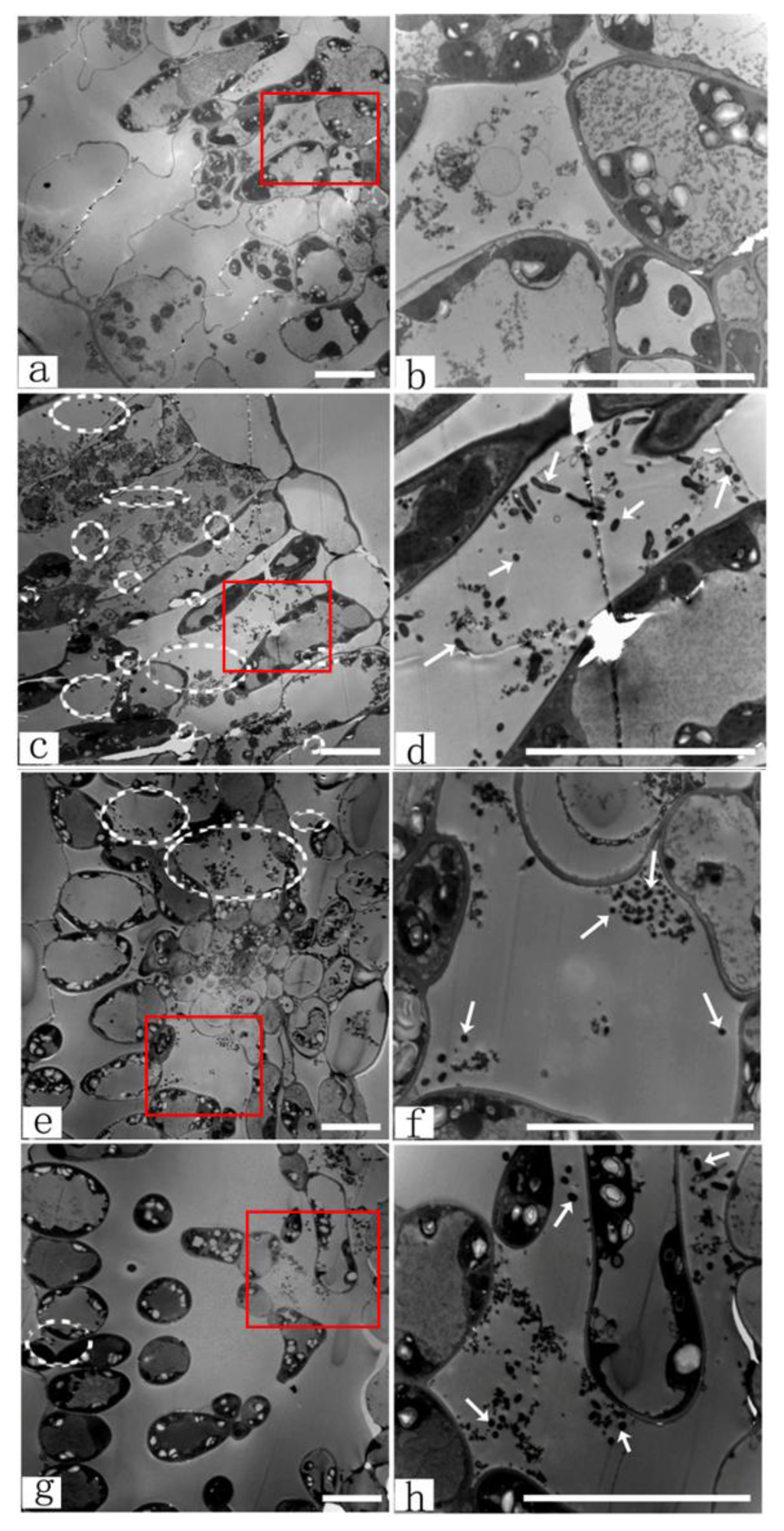 Transmission electron micrographs of the different leaf ages with Agrobacterium invasion in intercellular spaces. Leaf explants were infected with Agrobacterium at OD600 ranging from 0.8 to 1.0 and infected for 20 min to 30 min. The leaf explants were cut transversely. (a) and (b) Uninfected leaf as the control; (c) and (d) 30-day-old leaf explant; (e) and (f) 60-day-old leaf explant; (g) and (h) 90-day-old leaf explant. In c–h, Agrobacterium invasion into the intercellular space was indicated by white circles and arrows. The magnified images of the boxes in the left column (a, c, e, g) were placed in the right column (b, d, f, h), respectively. Scale bar 20 μm.