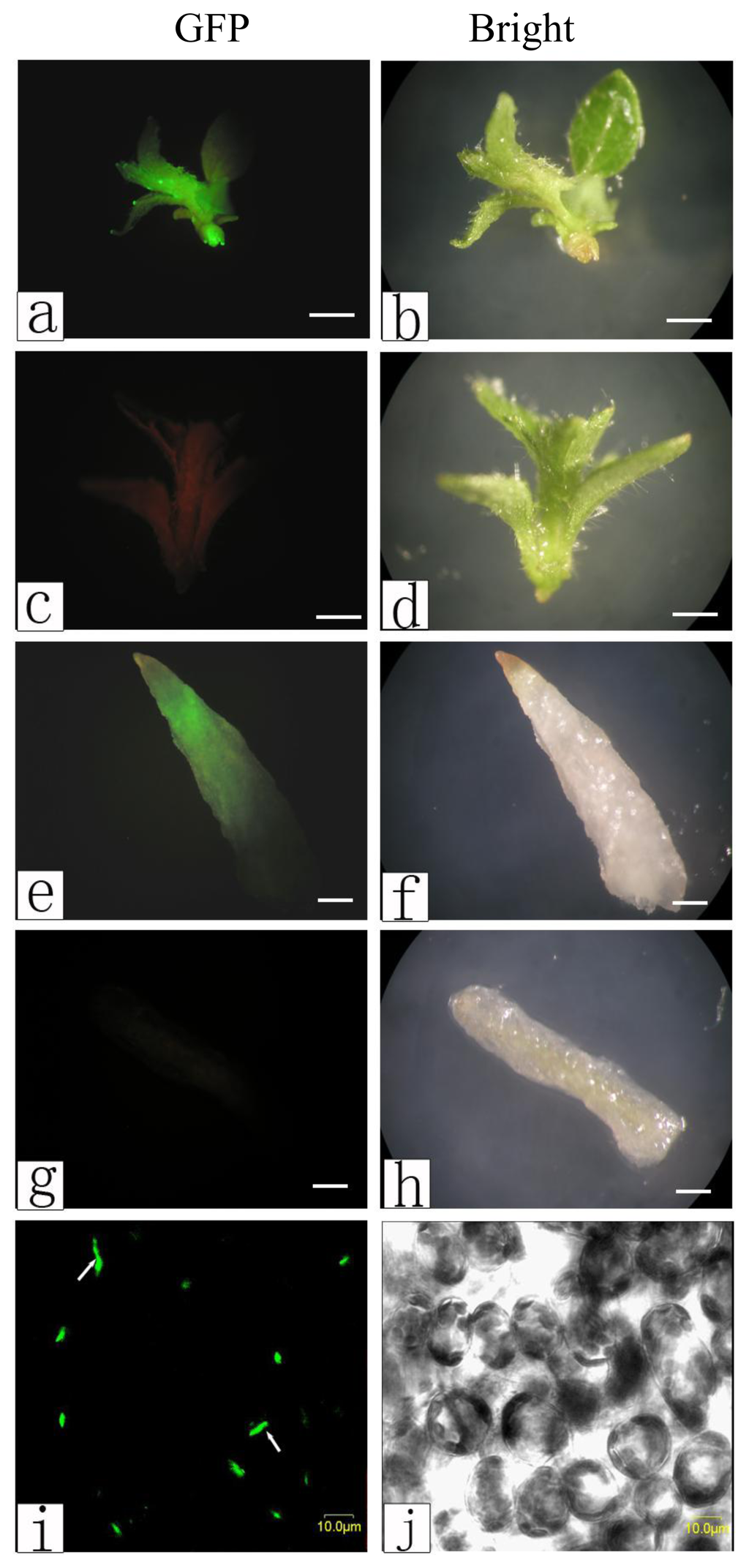 It is important to improve the transformation efficiency of poplar for genetic breeding and other applications. For example, the improvement of the transformation efficiency is crucial to build the full-length (fl) cDNA overexpression (FOX) hunting system and T-DNA mutant system. FOX requires large numbers of dominant mutations that enable the comprehensive characterization of mutant phenotypes and the identification of functional genes. 15,000 transgenic lines were used for expressing Arabidopsis full-length (fl) cDNAs [], and >23,000 independent Arabidopsis transgenic lines for expressing rice fl-cDNAs []; Nakamura et al. [] generated approximately 12,000 FOX-rice lines. Busov et al. [] also reported that from the 627 independent activation-tagged poplar lines, nine exhibited an obvious morphological phenotype that had never been seen among the thousands of transgenic poplars produced.