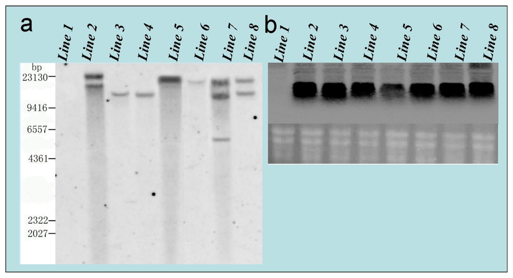 (a) Southern blot analysis of transgenic poplar. Poplar DNA was digested with Bam HI, electrophoresed, and probed with DIG-labeled MD–GFP gene. Molecular weight DNA markers were shown on the left. Lane 1: non-transgenic poplar (control), and Lanes 2~8: transgenic poplar lines; (b) Detection of the transgene by Northern blot analysis. Analysis of the exogenous MD–GFP expression of the transgenic lines by Northern blot. Lane 1: non-transgenic poplar (control), and Lanes 2~8: transgenic poplar lines.