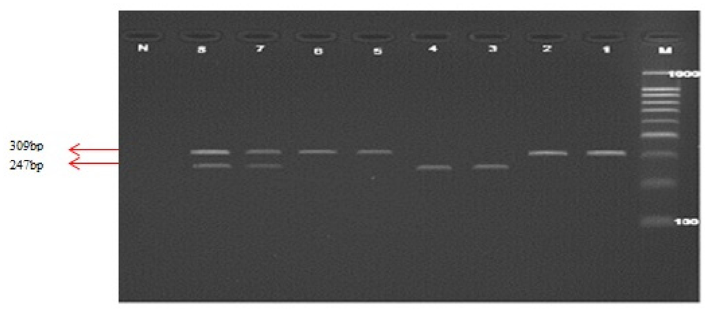 In Figure 2, Lane M illustrates the 100 bp DNA ladder. Lanes 1 and 2 show the PCR products (309 bp), Lanes 3 and 4 show the wild type fragments (247 bp), Lanes 5 and 6 show the mutant type fragment (309 bp), Lanes 7 and 8 show the heterozygote fragments (309 and 247 bp) and Lane N represents the negative test control.