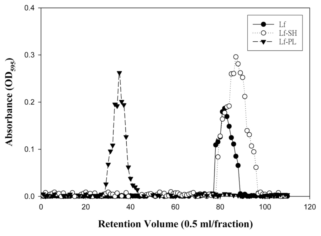 Chromatograms of Lf-PL together with Lf and Lf-SH on a SepharoseTM 4B gel-filtration column eluted with normal saline.