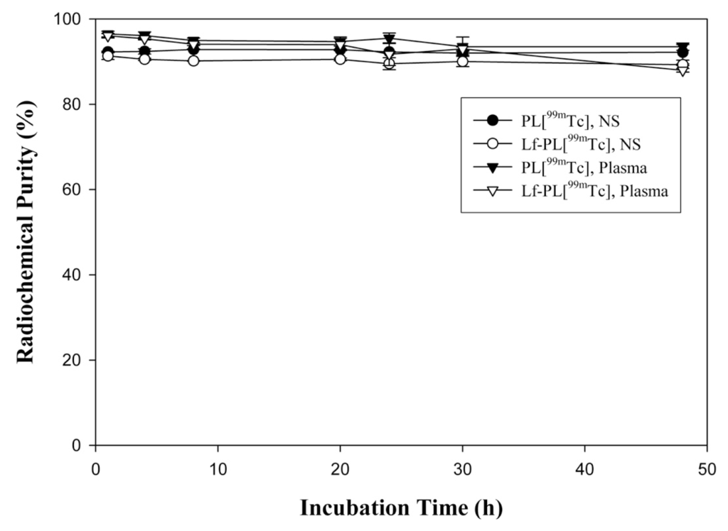 The stability of PL[99mTc] and Lf-PL[99mTc] during incubation in normal saline at room temperature and rat plasma at 37 °C is shown in Figure 2. Either PL[99mTc] or Lf-PL[99mTc] showed high stability with over 87% intact after 48 h of incubation in both conditions which was suitable for in vitro and in vivo studies.