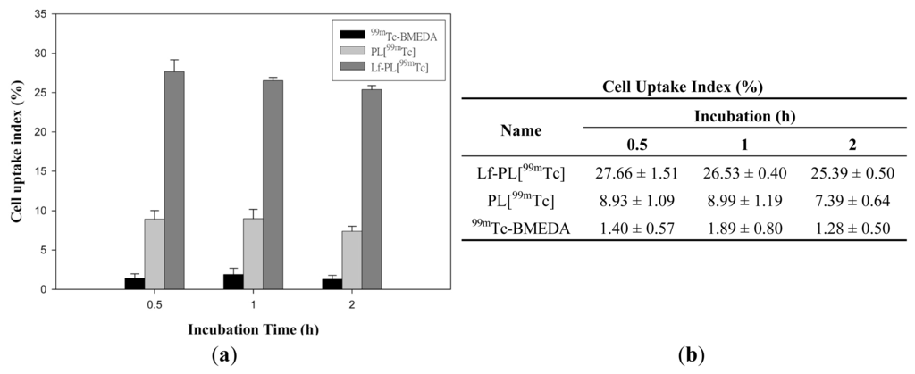 The in vitro cell uptake index of Lf-PL[99mTc], PL[99mTc], and 99mTc-BMEDA was evaluated in a mouse brain endothelia cell line, bENd.3 cells, with incubation at 37 °C for 0.5, 1, and 2 h (Figure 3). The incubation time did not affect the uptake level in all three groups. However, Lf-PL[99mTc] showed significant higher uptake compared to PL[99mTc] or 99mTc-BMEDA. The significant higher uptake values (p < 0.0001) between Lf-PL[99mTc] and PL[99mTc] in bEnd.3 cells indicated that the enhanced uptake efficacy was mediated by Lf receptor. This receptor was also found high level of expression in brain endothelial capillary cells (BCECs) [20]. Hence, further examination of in vivo animal study with Lf-conjugated liposome is needed to validate more precisely the relationship with affinity between Lf and Lf receptor in the BBB.