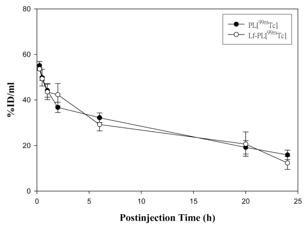 Six normal male BALB/c mice (4~5 week-old) were used for the pharmacokinetic study. Animals were divided into two groups with three mice in each group. Mice were intravenously administrated with either PL[99mTc] (3.7 MBq/100 μL, 4 μmole/mL) or Lf-PL[99mTc] (3.7 MBq/100 μL, 4 μmole/mL). Blood samples were collected at 0.25, 0.5, 1, 2, 6, 20, and 24 h post-injection by cardiac puncture each with volume of 20–50 μL by a 29 gage needle after temporary anesthesia by 2% isoflurane [30]. The concentrations of radioactivity in the blood were calculated and expressed as percentage of injection dose per milliliter (%ID/mL). Pharmacokinetic parameters were determined using the WinNonlin softwere (version 5.0.1) (Pharsight: Mountain View, CA, USA). Non-compartmental analysis model 201 (IV-Bolus Input) was used along with the log/linear trapezoidal rule. Pharmacokinetic parameters including elimination half-life (T1/2), mean residence time (MRT), maximum concentration (Cmax), total body clearance (Cl), and area under the curve (AUC) were determined.