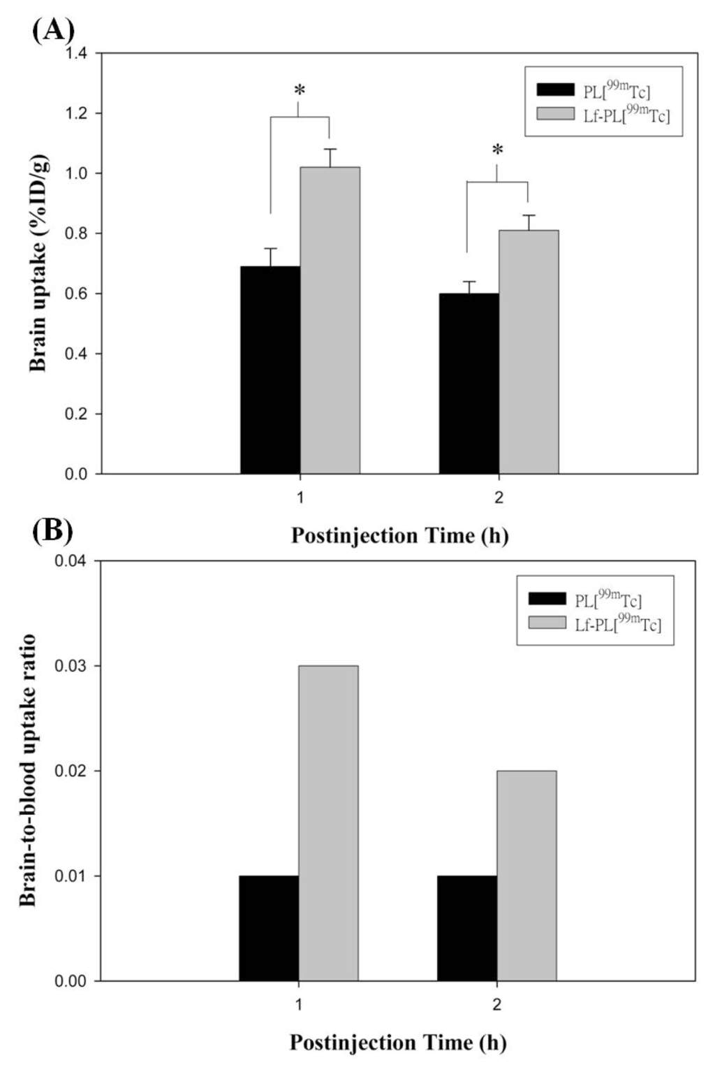 (A) Brain uptakes of PL[99mTc] and Lf-PL[99mTc] in BALB/c mice at 1 and 2 h post-injection. Note: (mean ± SD, n = 3), * indicates p < 0.05. (B) Brain-to-blood uptake ratios for PL[99mTc] and Lf-PL[99mTc] in BALB/c mice at 1 and 2 h post-injection.