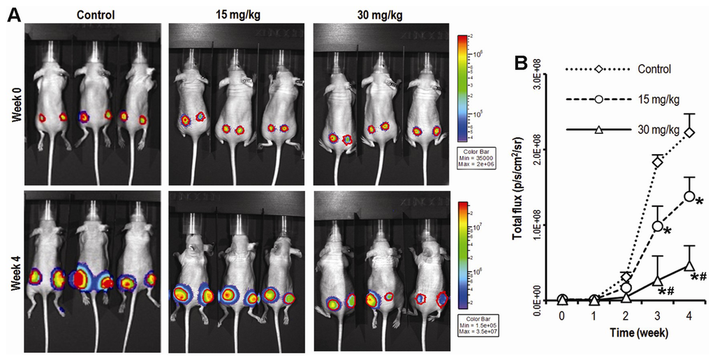 Compound K (CK) inhibits tumor growth in a xenograft model of colon cancer. (A) HCT-116 tumor growth was monitored using Xenogen bioluminescence imaging on a weekly basis. Representative Xenogen imaging results at week 0 and week 4 are shown; (B) Quantitative analysis of Xenogen bioluminescence imaging. Average tumor sizes at the indicated time points are represented with imaging signal intensities (in photons/second/cm2/steradian). (n = 5, * p < 0.01, compared with control; # p < 0.05, compared with the 15 mg/kg group).