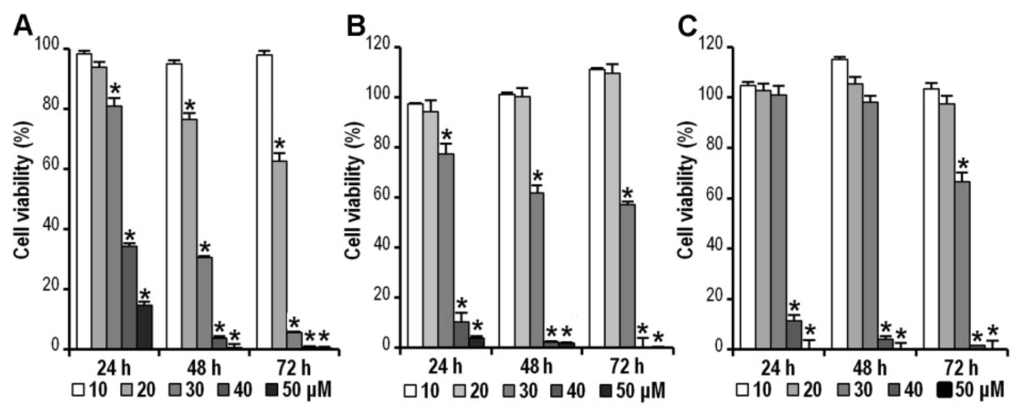 HCT-116, SW-480, and HT-29 cells were seeded in 96-well plates at a concentration of 5000 cells/well, allowed to attach overnight and then exposed to different concentrations of CK (10, 20, 30, 40 and 50 μM). Cell proliferation was measured at 24, 48, and 72 h later using the Cell Titer 96 Aqueous MTS Reagent (Promega, Madison, WI, USA) according to the manufacturer’s protocol. The absorbance was measured by an automated microplate reader (Epoch; Bio-Tek Instruments, Winooski, VT, USA) at 490 nm. Results were expressed as a ratio of treated cells versus control (vehicle set at 100%).