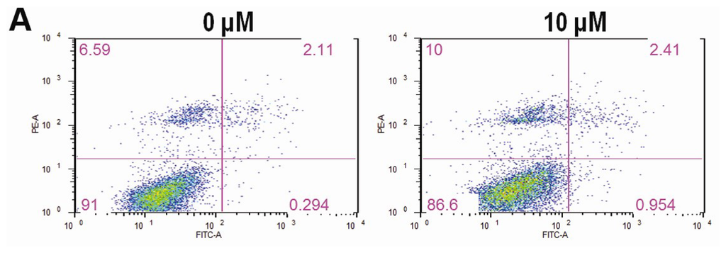 5 × 104 HCT-116 cells were seeded in 24-well plates. After 24 h, CK was added at the indicated concentrations. After 72 h treatment, all adherent (trypsin digest) and non-adherent floating cells were collected, and centrifuged for 5 min at 600g. Then the cells were stained with Annexin-V (FITC) and propidium iodide (PI) (Becton Dickinson, San Diego, CA, USA) according to the manufacturer’s instructions. The stained cells were subsequently analyzed by a FACS Canto flow cytometer (Becton Dickinson, Mountain View, CA, USA). All experiments were performed in three independent plates, and run in triplicate each time. At least 10,000 cells were counted each time for analysis.