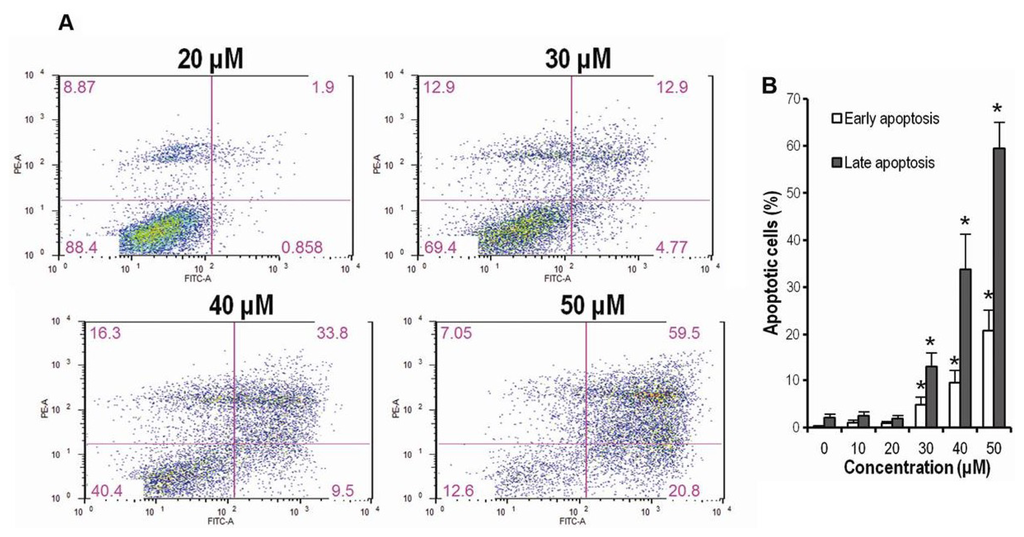 Annexin-V/PI staining assays were employed to investigate whether CK could induce HCT-116 cell apoptosis, since other ginseng extracts have been shown to induce apoptosis in colorectal cancer cells. In this assay, HCT-116 cells were treated with indicated graded concentrations (10–50 μM) of CK for 72 h. Apoptotic cells were determined by flow cytometry using Annexin V/PI double labeling. The fraction of early apoptotic cells (Annexin V-FITC positive) was increased in a dose-dependent manner at doses greater than 30 μM (4.77%, 9.5% and 20.8%, Figure 3A); the fractions of late apoptotic or necrotic cells were also markedly increased compared to DMSO (vehicle) treated cells (12.9%, 33.8% and 59.5%, Figure 3A). Figure 3B showed that CK significantly promoted both early and late stages of apoptosis in HCT-116 cells (* p < 0.01) at concentrations greater than 30 μM.