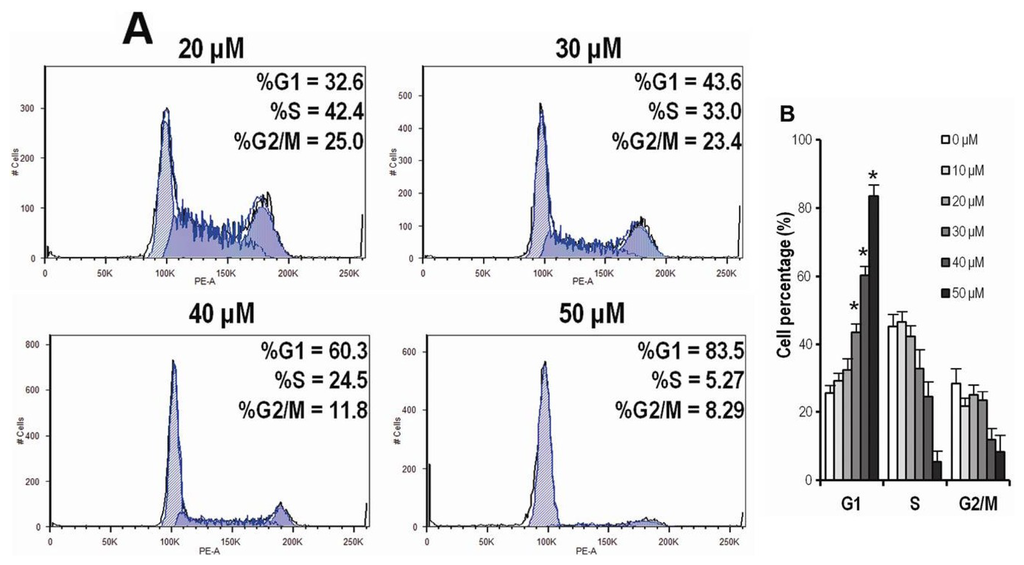 To identify the effect of CK on the cell cycle of HCT-116 cells, we determined the cell cycle distribution of the cells treated with vehicle or different graded concentrations of CK (10–50 μM) for 48 h using PI staining. As shown in Figure 4A,B, CK induced significant G1 cell cycle arrest in a dose-dependent manner at concentrations greater than 30 μM (* p < 0.01), with a G1 cell percentage of 43.6%, 60.3%, and 83.5% compared to the control at 25.5%. The FACS data in Figure 4 lacked cells with sub-G1 levels of DNA (thus apoptotic), while data in Figure 3 did show a substantial fraction of apoptotic cells.