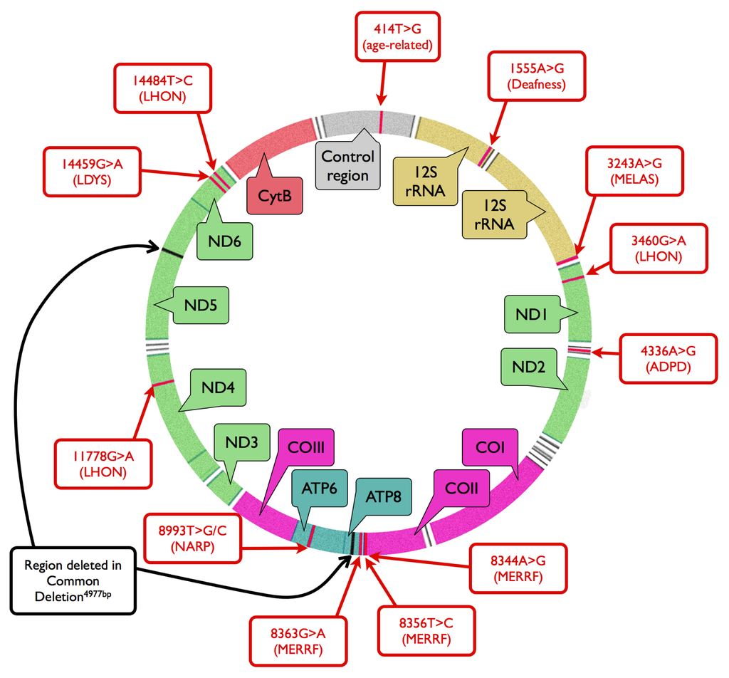 - Pitceathly, R.D.; Rahman, S.; Hanna, M.G. Single deletions in mitochondrial DNA—Molecular mechanisms and disease phenotypes in clinical practice. Neuromuscul. Disord 2012, 22, 577–586. [Google Scholar]