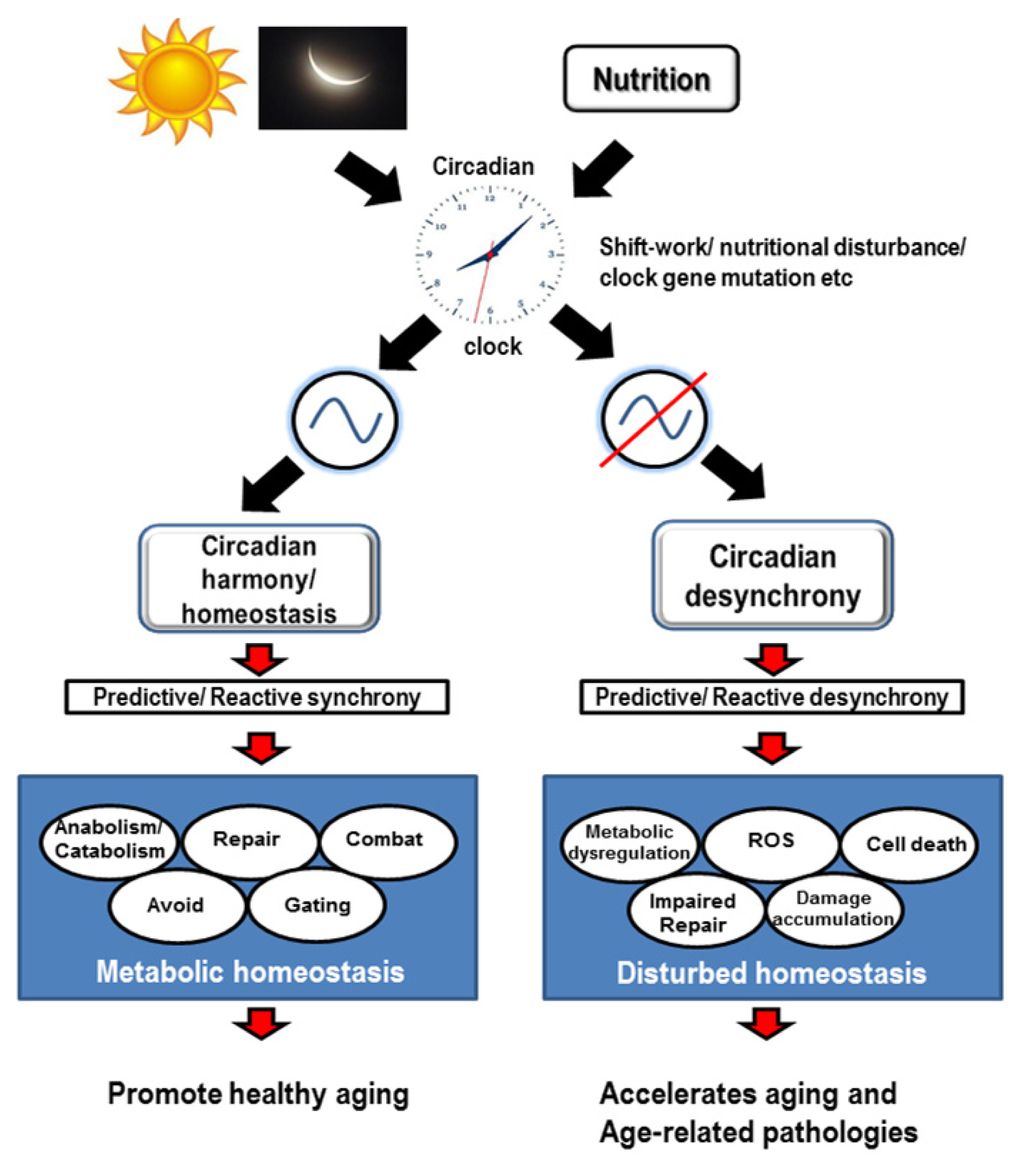 A schematic representation of the role of clocks in cellular tasks resulting from predictive/reactive synchrony or desynchrony impacting cellular homeostasis and consequently affecting healthy aging. Light-dark cycles as well as nutrition play an important role as zeitgebers (time-givers) resulting in synchronous functioning of the clock and clock controlled genes (CCGs) which regulate metabolism by coordinating anabolic and catabolic reactions, repair functions, combating/avoiding unfavorable stress situations as well as gating specific physiological, cellular and molecular events in a temporal fashion to achieve cellular metabolic homeostasis. Situations which impact the clock, such as shift-work, disturbance in the nutritional cues of even mutations in certain clock genes result in circadian desynchrony impairing the organisms ability to predict/react to changing demands of physiology which unbalances cellular homeostasis by metabolic dysregulation, reactive oxygen species (ROS) generation, affecting repair mechanisms leading to damage accumulation and apoptosis. This results in accelerated aging and propensity for age-related pathologies.