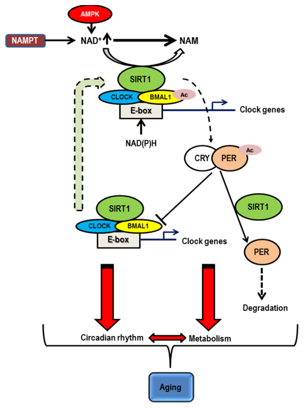 A representation of SIRT1- mediated regulation of the circadian clock and metabolism impacting aging. SIRT1 interacts with CLOCK, which heterodimerizes with BMAL1. BMAL1 is deacetylated by SIRT1 in a circadian manner and promotes expression of clock genes. Additionally, SIRT1 interacts with and deacetylates PER2 (in mammals) which heterodimerizes with CRY proteins to inhibit CLOCK-BMAL1 function and promotes its degradation. NAD+ from AMPK and NAMPT is a key regulator for SIRT1 function. Synchronous expression of clock genes results in regulation of clock controlled genes (CCGs) which impact metabolism and hence aging.