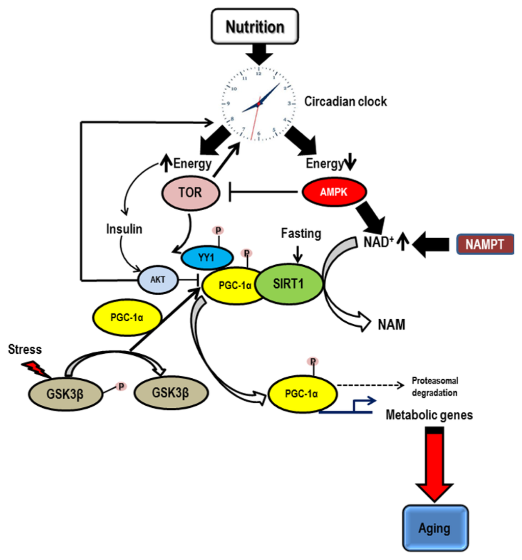 Regulation of PGC-1α—this schematic represents the relationship between nutrition, circadian clock and other regulatory factors involved in post-translational modification of PGC-1α and its consequent impact on metabolic genes and aging. Nutritional availability impacts the circadian clock - when energy is replete, TOR results in transcriptional regulation of PGC-1α through transcription factor YY1 (see text for details). The serine threonine kinase AKT (a key component of insulin signaling pathway) has an inhibitory effect (negative regulator) on PGC-1α. In energy deficient situations, AMPK has an inhibitory effect on TOR thus inducing PGC-1α and increased mitochondrial biogenesis. SIRT1 has a stimulatory deacetylation effect on PGC-1α under conditions of fasting and oxidative stress and helps accumulate it in the nucleus. Both TOR and AKT feed-back on the circadian clock and regulate it as a pacemaker. The nutrient sensitive kinase GSK3β targets PGC-1α for proteasomal mediated degradation and is a function of oxidative stress response. PGC-1α by its transcriptional activity plays an important role in the expression and activity of many metabolic genes which impact longevity.