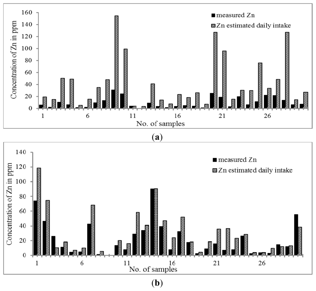 (a) Distribution of Zn content in Chinese THM with estimated daily intake; (b) Distribution of Zn content in Malay THM with estimated daily intake.