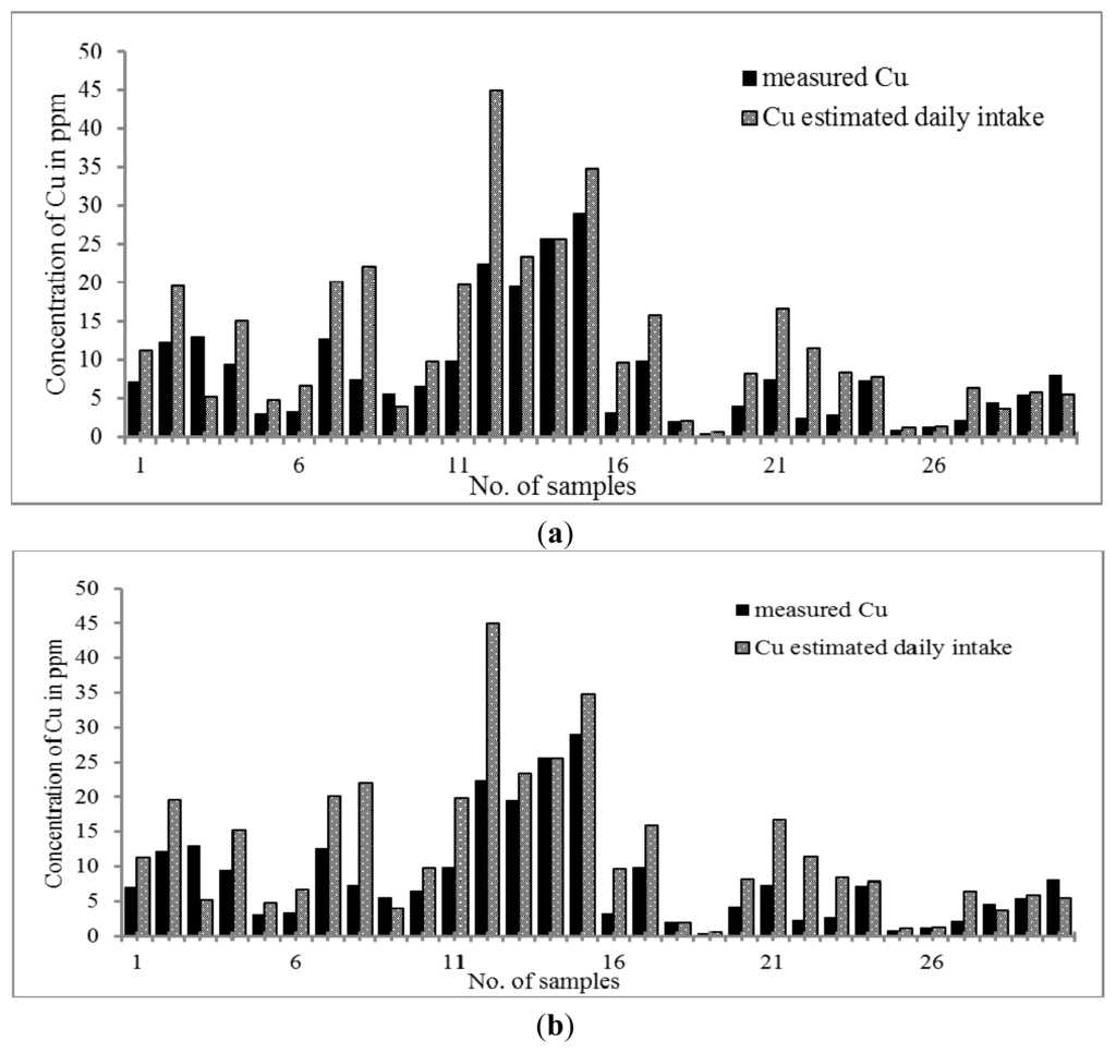 Figure 3a,b reveal that both Malay and Chinese THMs contain Cu in the range of 0.40–28.95 μg g−1 and 0.24–8.49 μg g−1; respectively. The pattern of distribution was quite similar to that of Mn and Zn. The Cu content was higher in Malay than Chinese THM whereas the daily intake of copper was higher in Chinese THM. The daily intake exhibits a trend wherein Chinese THM shows a higher Cu content. As far as both kinds of THM are concerned, there are significant increments of Cu. The concentration of Cu in Chinese THM increased from 0.24–8.49 μg g−1 to 0.80–33.95 μg day−1 while in Malay THM from 0.40–28.95 μg g−1 to 0.60–44.96 μg day−1. Cu contents were comparatively lower than the RDA (0.2 to 1.3 mg per day) value. However, the concentration of Cu present in both THMs was considerably essential. Previous studies showed that Cu plays an important role in the expression of certain human genes at the optimum concentration []. However, high consumption of Cu l causes chronic damage to the liver [].