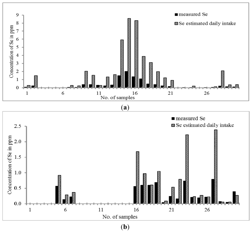 (a) Distribution of Se content in Chinese THM with estimated daily intake; (b) Distribution of Se content in Malay THM with estimated daily intake.