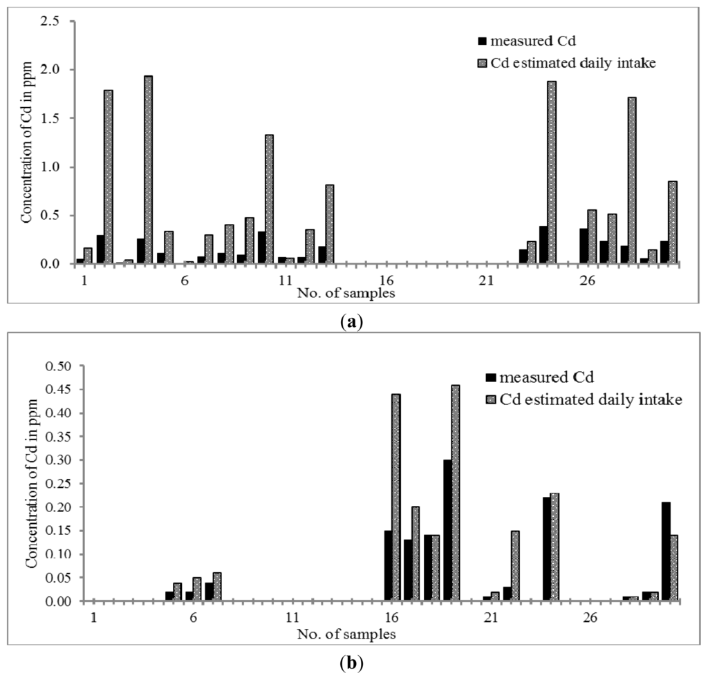 Cd is considered a toxic element. A previous finding showed that Cd could be toxic to placenta [] due to its prohibition on cell proliferations [–]. By referring to Figure 5a,b, the concentration of Cd ranges between 0.07 and 0.39 μg g−1 and between 0.01 and 0.30 μg g−1 in Chinese THM and Malay THM; respectively. Both THMs were considered to have a low Cd content compared to the limit stated by the U.S. Pharmacopoeia (3 mg g−1). Only 63% of Chinese THM and 43% of Malay THM studied contains Cd. When the daily intake of both THMs was considered, the concentration of Cd in Chinese and Malay THM increased up to 0.03–1.79 μg day−1 and 0.01–0.44 μg day−1, respectively. Therefore, we can conclude that the concentrations of Cd in the daily intake of Chinese THM samples are still in the acceptance range and not approaching the maximum limit of cadmium stated by the U.S. Pharmacopoeia (USP). However, continuous consumption of Chinese THM will cause a huge accumulation of Cd in the body. Cd can cause intracellular damage such as protein denaturation, lipid peroxidation, generation of reactive oxygen species and DNA strand breaks [–].