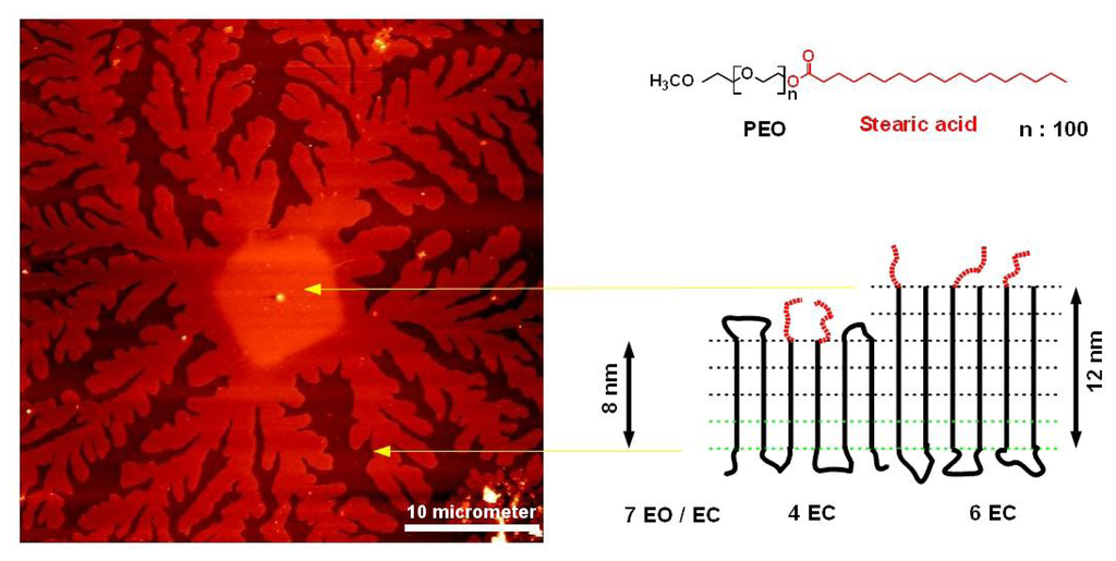 - Zhai, X.M.; Wang, W.; Zhang, G.L.; He, B.L. Crystal pattern formation and transitions of PEO monolayers on solid substrates from nonequilibrium to near equilibrium. Macromolecules 2006, 39, 324–329. [Google Scholar]