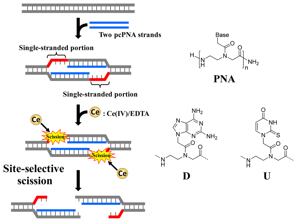 Figure 1. First, two pcPNA strands (the blue lines) bind to the complementary sequence in the DNA according to Watson–Crick rule, and form so-called double-duplex invasion complex. It should be noted that the binding sites of these two pcPNAs are designed to be laterally shifted to one another by several nucleobases. Thus, in the invasion complex, unpaired single-stranded portions (the red parts) are formed at the predetermined sites in both strands of the double-stranded DNA. These single-stranded portions are selectively hydrolyzed by the Ce(IV)/EDTA, since this complex hydrolyzes only single-stranded DNA.