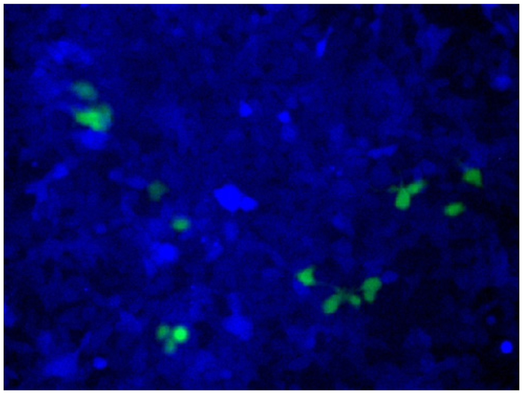 EGFP fragment (742 bp). This donor fragment has no promoter so that it cannot be expressed alone in the cells. Only when the targeted homologous recombination occurs, green fluorescence should be observed. After incubation for two days, many human cells emitted green fluorescence, confirming that the recombination successfully proceeded in the human cells (see the fluorescence microscope images in