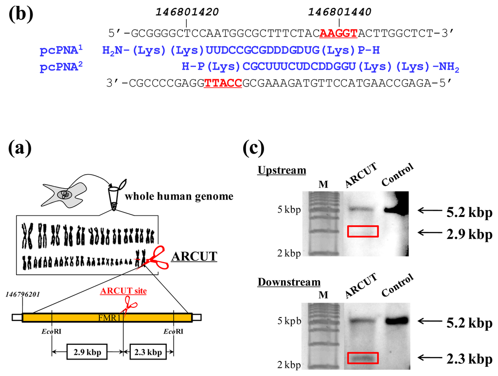 14]. As the targeted scission site, one site in FMR1 (Fragile X Mental Retardation 1) gene in the X chromosome was chosen (this choice is arbitrary). This 38-kbp gene is highly conserved and involves CGG trinucleotide repeats in its 5′ untranslated region. If the number of this repeat exceeds 200 and abnormal hypermethylation occurs, the transcription of protein (FMRP) from this gene is silenced and fragile X syndrome is induced. For the site-selective scission by ARCUT, the whole human genome was isolated from cultured human cells, and first incubated with 1:1 combination of pcPNAs. One of the pcPNA strands is complementary to A146801423-C146801437 in the upper strand of FMR1 gene, and another pcPNA is complementary to G146801428-A146801442 in the lower strand (