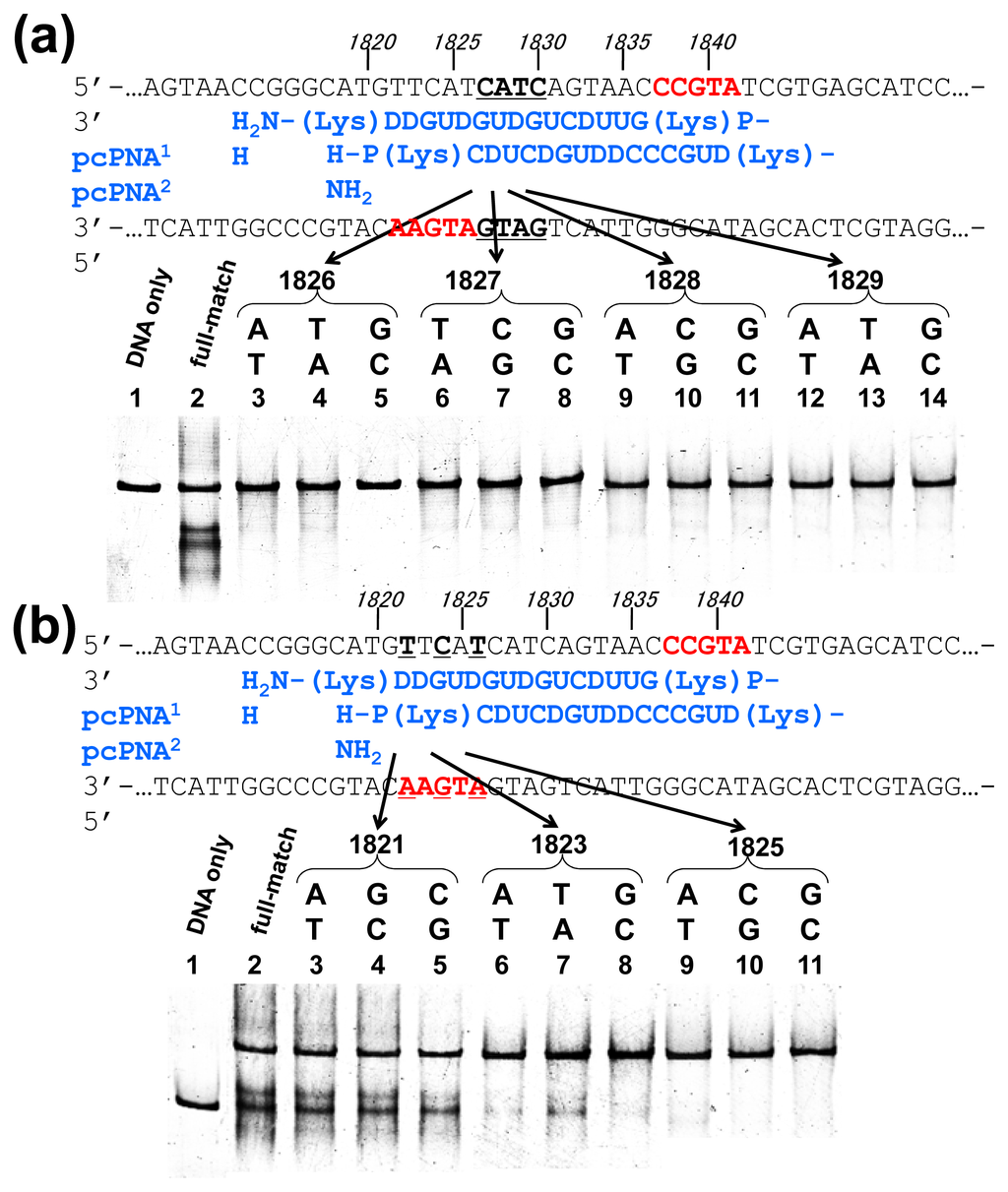 Figure 3a). In other words, alteration of only one base-pair in this region to another pair completely diminishes the scission by the ARCUT. Note that alteration of one base-pair in the double-stranded DNA intrinsically induces two mismatches to the whole system (one mismatch is between the upper strand of the DNA and one pcPNA strand, and another mismatch is between the lower strand and another pcPNA). On the other hand, the recognition in the flanking terminal region, where only one pcPNA binds to the DNA, is less strict (