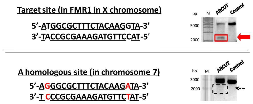 9]. In the human genome, there are many analogous sites, which are different from each other by only one or two base-pairs in the sequence (e.g., in 20-bp length). However, it was confirmed that ARCUT strictly distinguishes the target site from highly analogous sequences and cuts only the former. For example, the ARCUT which is designed to target a site in FMR1 cuts this site satisfactorily (