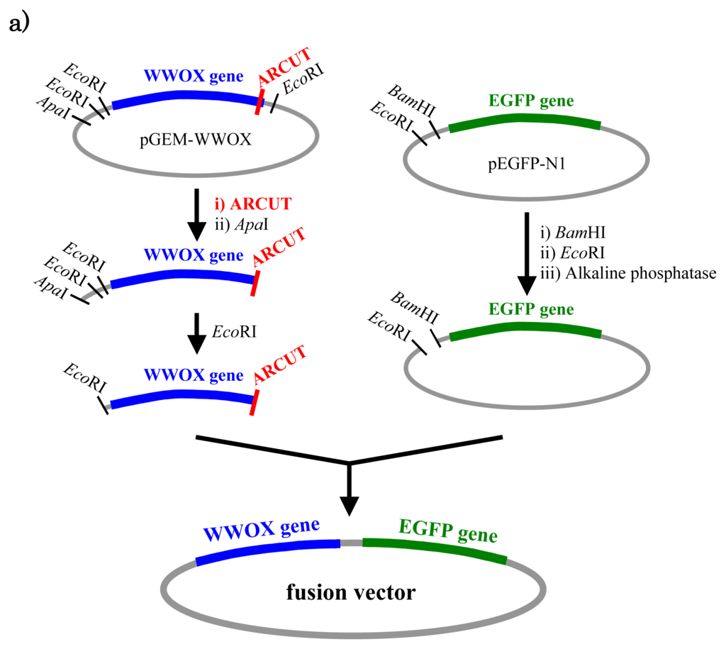 Figure 5, a cancer-related protein WW-domain-containing oxidoreductase (WWOX) was fused with enhanced green fluorescent protein (EGFP) by using ARCUT-based cut-and-paste method. There are three key points in this manipulation. The first one is to cut the