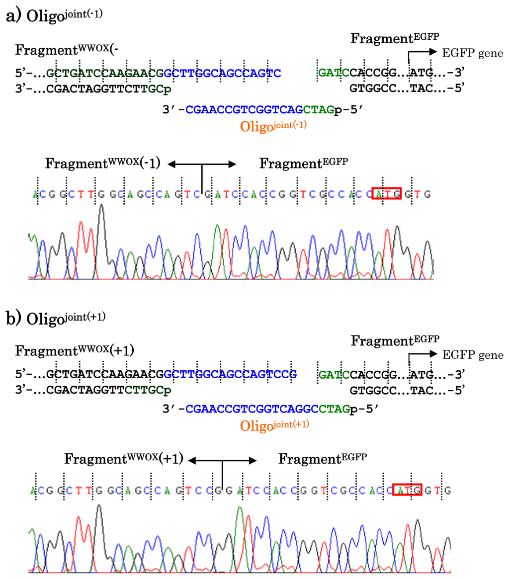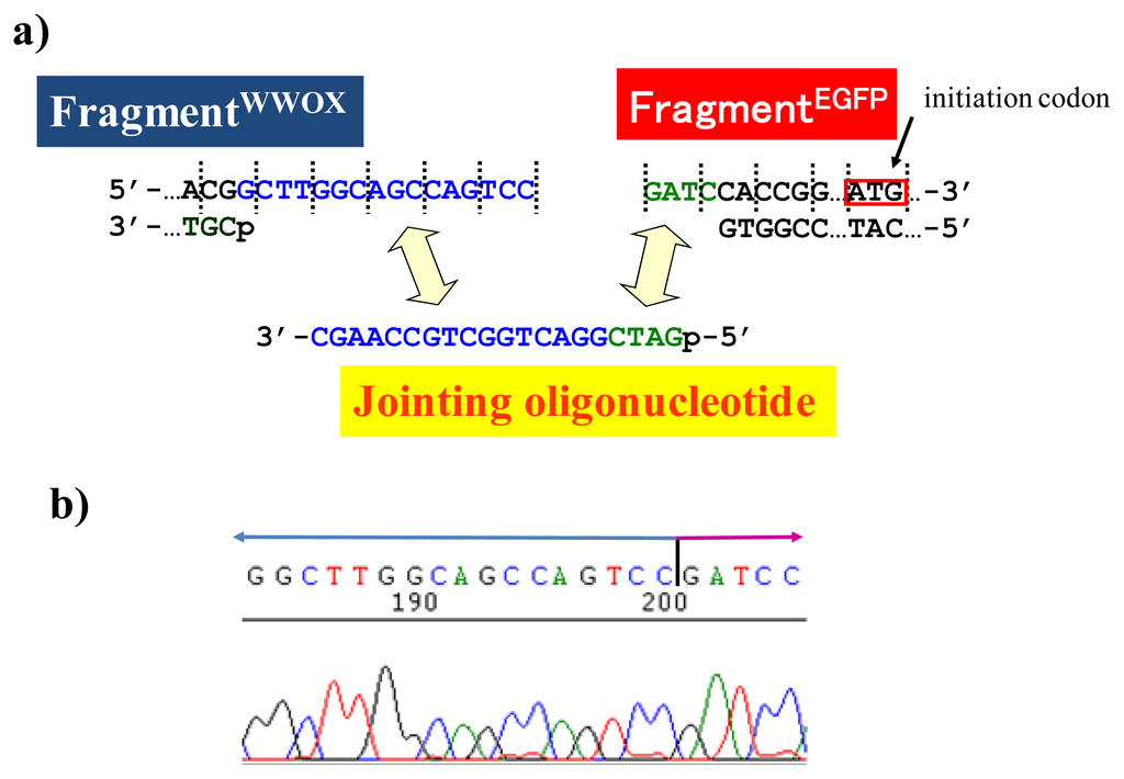 BamHI just before the initiation codon. The downstream end of the WWOX fragment involves protruding upper strand (16-base sequence), whereas the upstream end of the EGFP fragment is