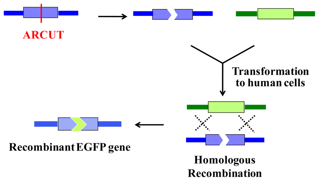 Figure 10). Endogenous genes in human cells can be also converted to desired sequence, simply by designing the appropriate ARCUT. These biological recombinations ultimately provide the same results as “cut-and-paste” method, and, importantly, can be successfully achieved in human cells. Strong potential of ARCUT for future applications has been clearly indicated.