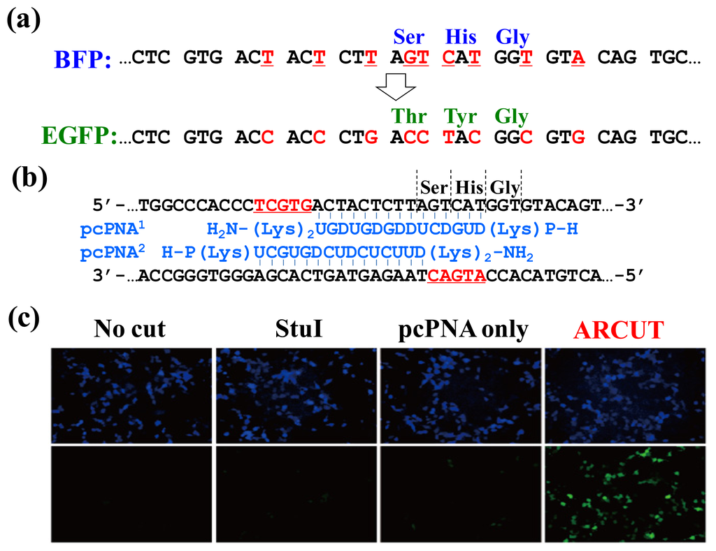 GFP gene in human cells through the ARCUT-induced homologous recombination. It is conclusive that the site-selective scission by ARCUT is satisfactorily recognized by the repair systems in human cells, even when the scission products have very unique termini structures.