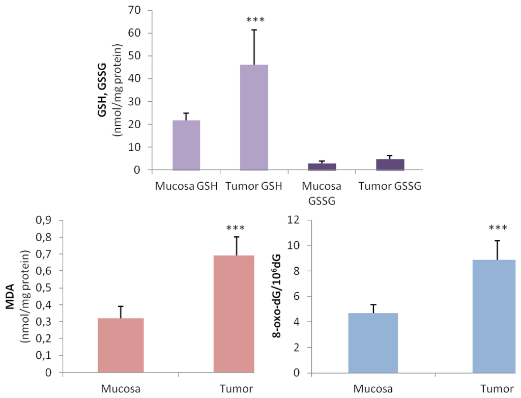 Oxidative stress by-products in gastric carcinoma vs. normal mucosa. Tissues were obtained as outlined in the Experimental Section and dealt with appropriately for metabolite assays. A total of 28 paired samples were used. Results are expressed as means ± SD. *** p < 0.001 in the comparison between tumor and normal mucosa.