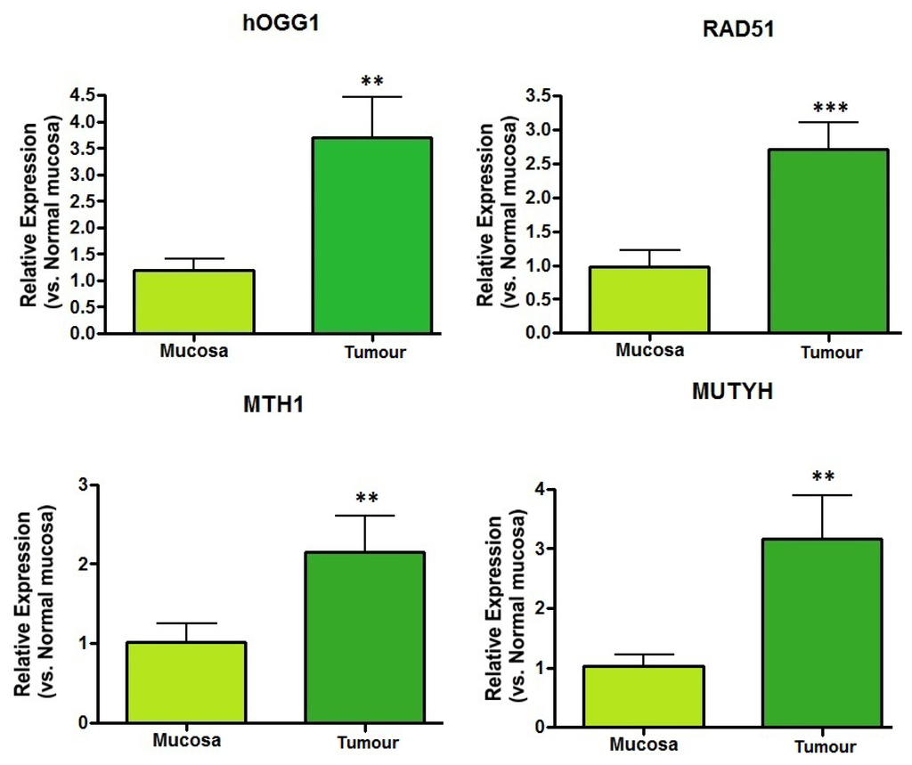 The DNA repair enzymes exhibited increased mRNA expression levels in the tumor specimens in comparison with the basal expression levels of normal tissue samples (Figure 2). The increases in relative mRNA expression levels in the gastric tumors vs. normal mucosa were highly significant for hOGG1 (p < 0.005), RAD51 (p < 0.001), MTH1 (p < 0.04) and MUTYH (p < 0.01), indicating enhanced DNA repair activity in these tumor cells.